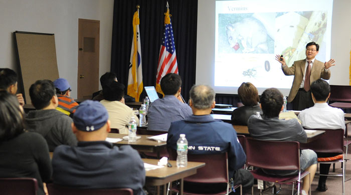 (사진 설명) 식품인 협회 세미나를 통해 회원들에게 사업 정보를 제공하는 식품인협회는 오는 9월에 EBT 머신 사용에 관한 세미나를 준비 중이다.지난 해 세미나에서 회원들에게 식품위생에 관하여 설명 하는 브라이언 손 시티인스페션)