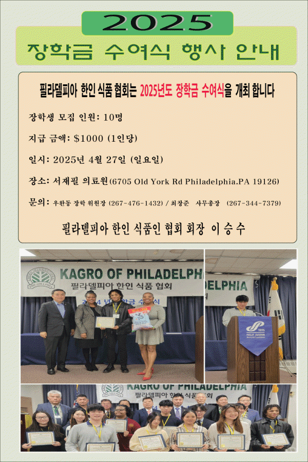 필라델피아 한인식품인협회는 2025년도 장학생을 모집하고 있다.