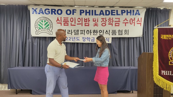 필라델피아 한인식품인협회는 서재필 봉사센터 에서 717 2022년도장학금 수여식을 갖고 센트럴 벅스 하이 스쿨의 김예준 학생과 애빙턴 하이스쿨의 자키안 자몬  한인과 미국 학생 10명에게  1 달러씩 1 달러의 장학금을 수여했다.